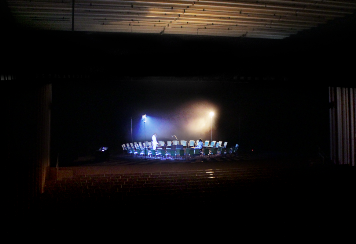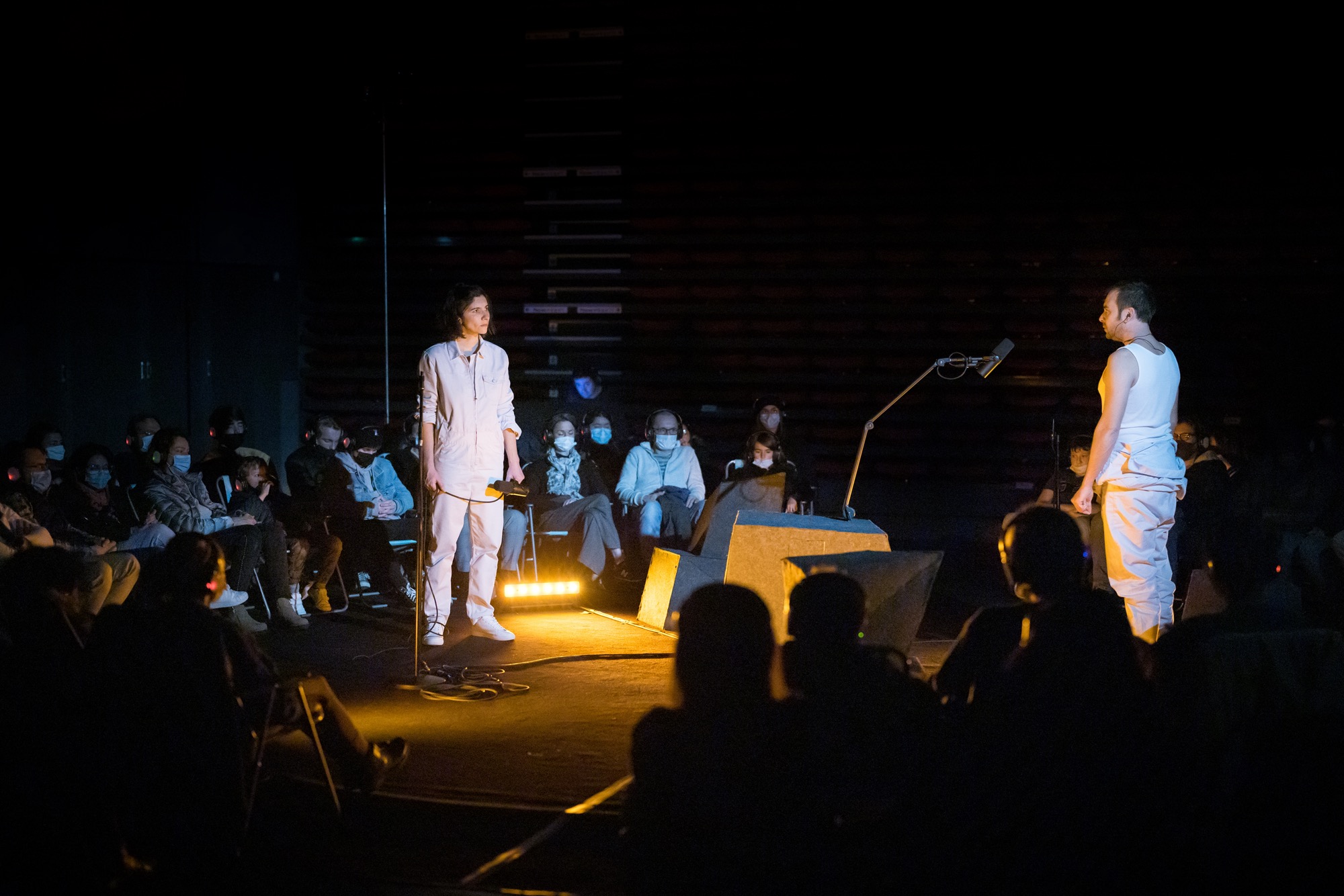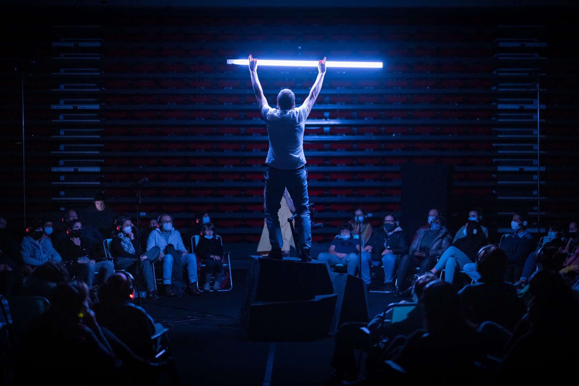 Le dispositif est simple : comédiens et musicien sont au centre de l’espace dans une semi pénombre ; autour d’eux, les spectateurs s’installent sur des transats. Un casque audio sans fil leur aura été remis à chacun à leur entrée. Chaque spectateur peut alors se plonger dans l’écoute du voyage martien, tout en observant le travail de création sonore opéré en direct.