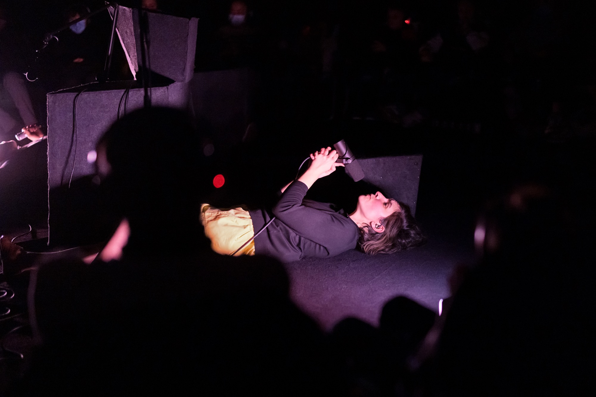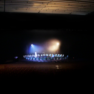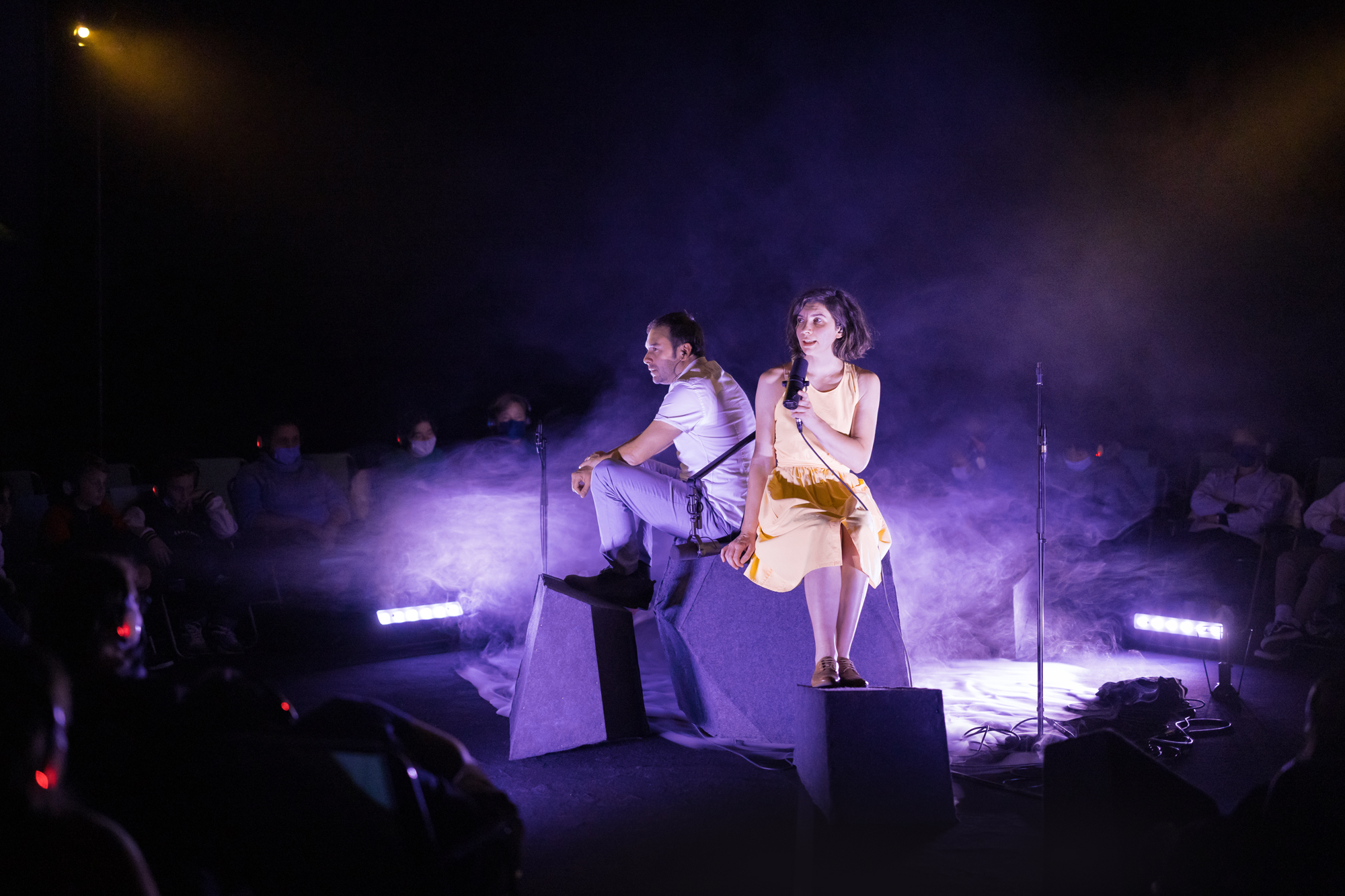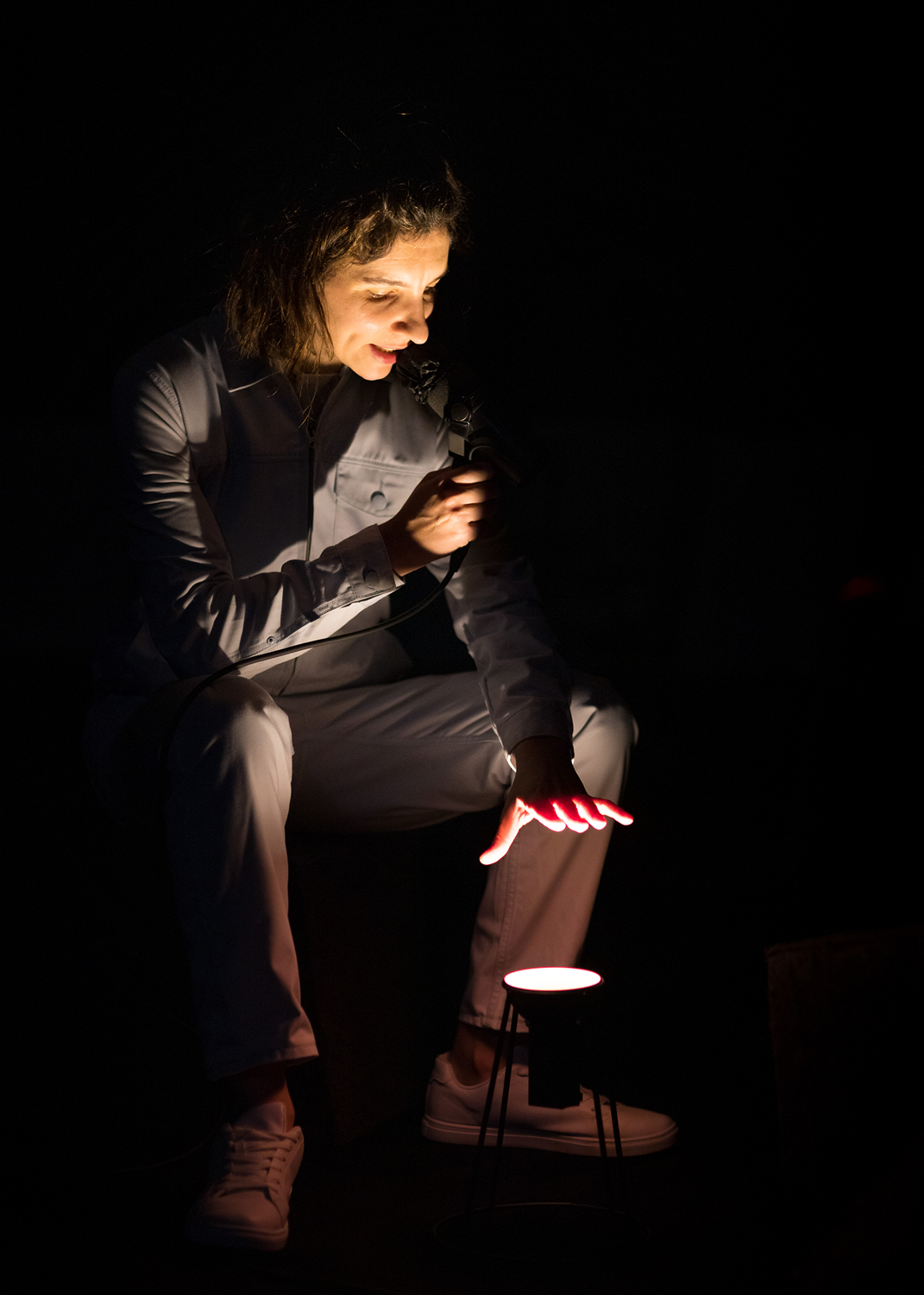 Le dispositif est simple : comédiens et musicien sont au centre de l’espace dans une semi pénombre ; autour d’eux, les spectateurs s’installent sur des transats. Un casque audio sans fil leur aura été remis à chacun à leur entrée. Chaque spectateur peut alors se plonger dans l’écoute du voyage martien, tout en observant le travail de création sonore opéré en direct.