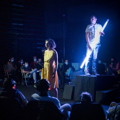 Le désir de développer nos expérimentations et de les partager avec des spectateurs-auditeurs en temps réel a abouti à un spectacle mettant en scène l’action de ces nouvelles au cœur d’un dispositif radiophonique à vue, pour une expérience immersive conjuguant théâtre et création sonore. Chroniques martiennes rejoue ainsi, au plus proche des spectateurs, l’épopée martienne de Ray Bradbury, dans une création abordant de façon ludique et réflexive quelques-uns de motifs les plus emblématiques de la science-fiction.