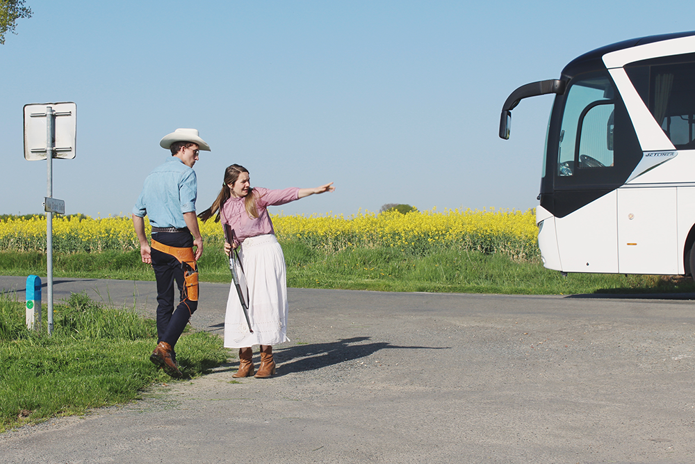Dans ce spectacle-travelling, le bus en mouvement accueillant les spectateurs devient une caméra leur offrant un regard nouveau sur leur territoire. Au cœur de cette caméra géante, chacun est invité à chercher les traces de ce western recomposé au sein du paysage, à repérer les apparitions des comédiens – dans un cadre s’étendant pour ainsi dire à 360 degrés. Le public est ainsi physiquement mis en situation, appelé́ à guetter littéralement le surgissement de la fiction au sein d’un contexte familier.