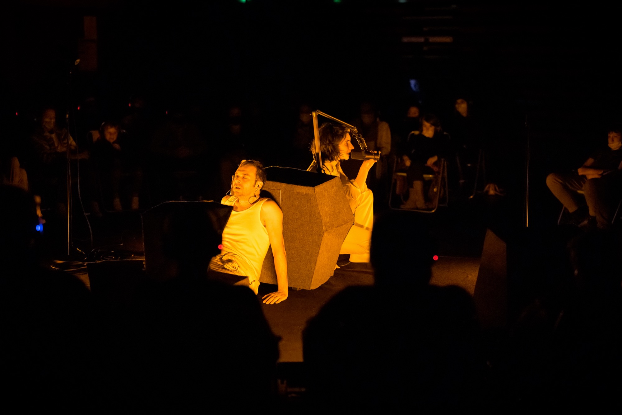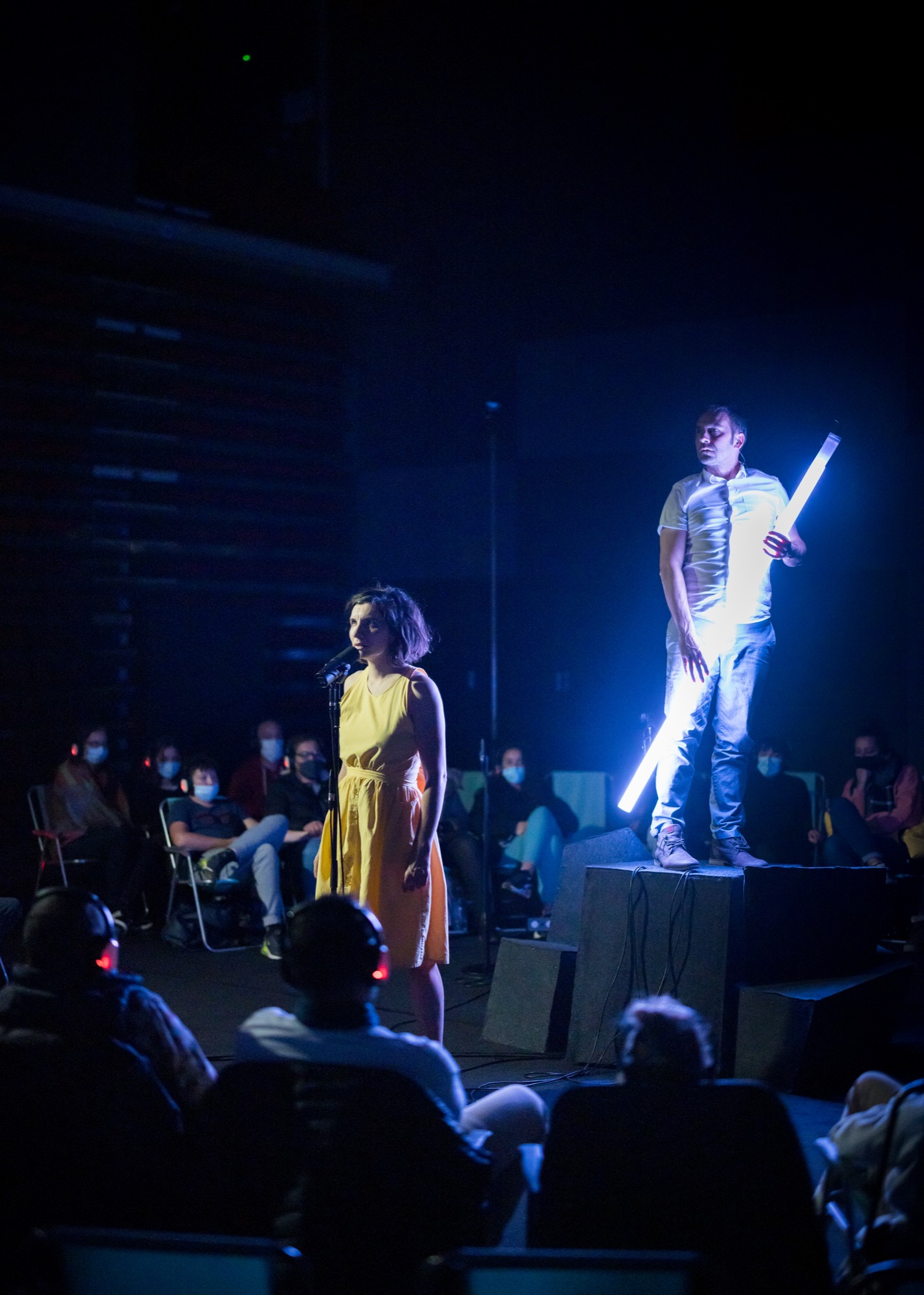 Le dispositif est simple : comédiens et musicien sont au centre de l’espace dans une semi pénombre ; autour d’eux, les spectateurs s’installent sur des transats. Un casque audio sans fil leur aura été remis à chacun à leur entrée. Chaque spectateur peut alors se plonger dans l’écoute du voyage martien, tout en observant le travail de création sonore opéré en direct.